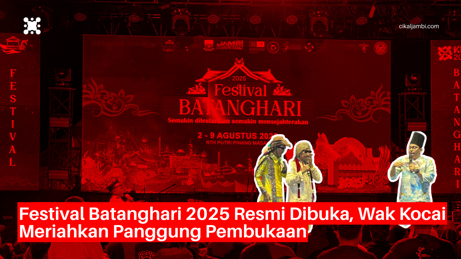 Jambi – Festival Batanghari 2025 resmi dibuka Sabtu Malam (2/8) di Ruang Terbuka Hijau (RTH) Putri Pinang Masak, Kota Jambi. Momen pembukaan diwarnai dengan aksi teatrikal Wak Kocai, tokoh ikonik budaya lokal, yang secara simbolis “memecahkan” panggung pembukaan dengan teatrikal dan pantun tradisional. Aksi tersebut disambut tepuk tangan meriah dari ribuan pengunjung yang memadati kawasan pinggiran Sungai Batanghari.